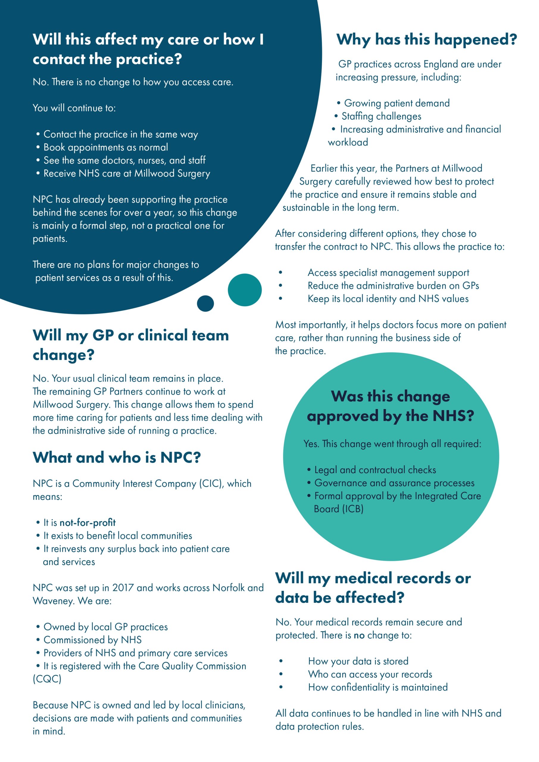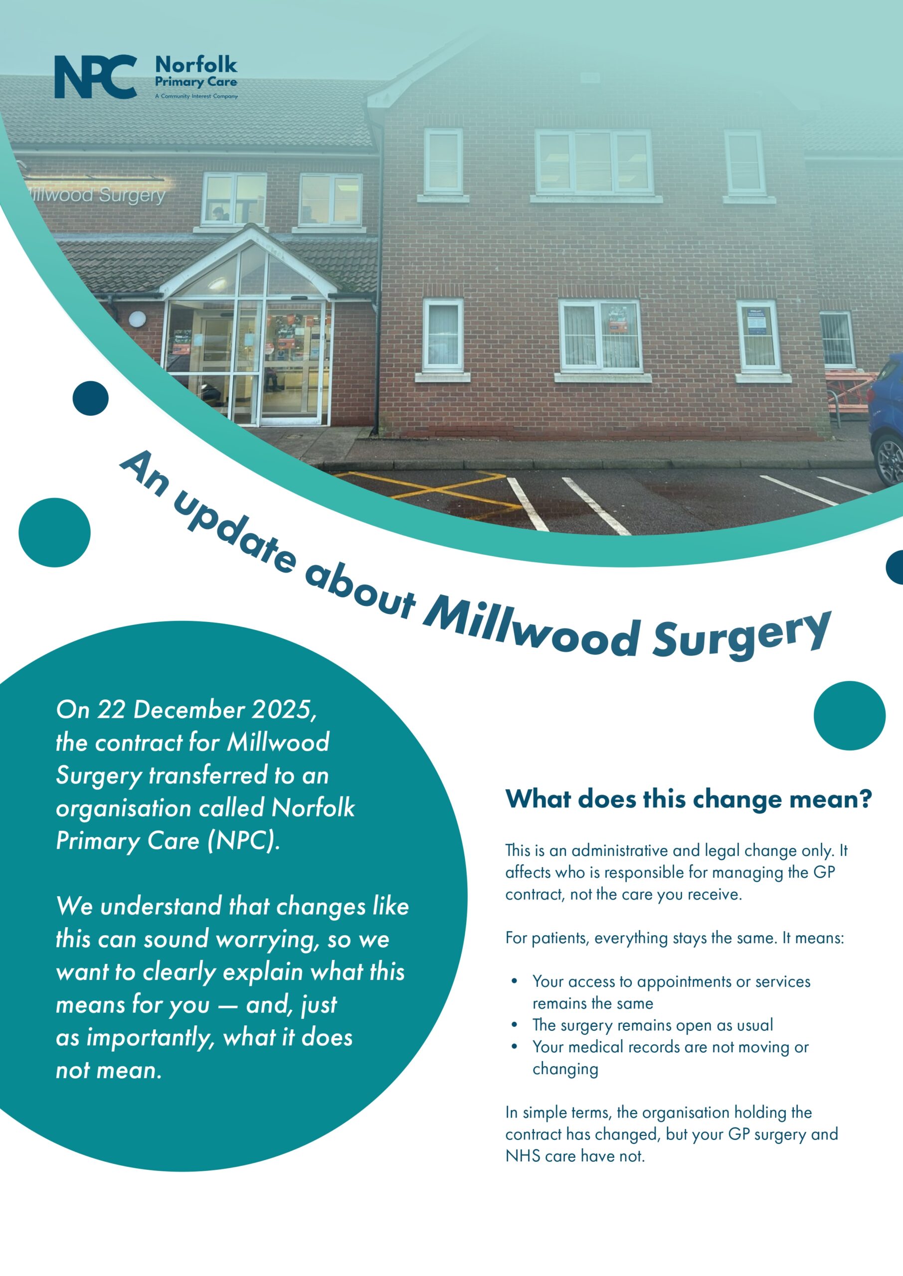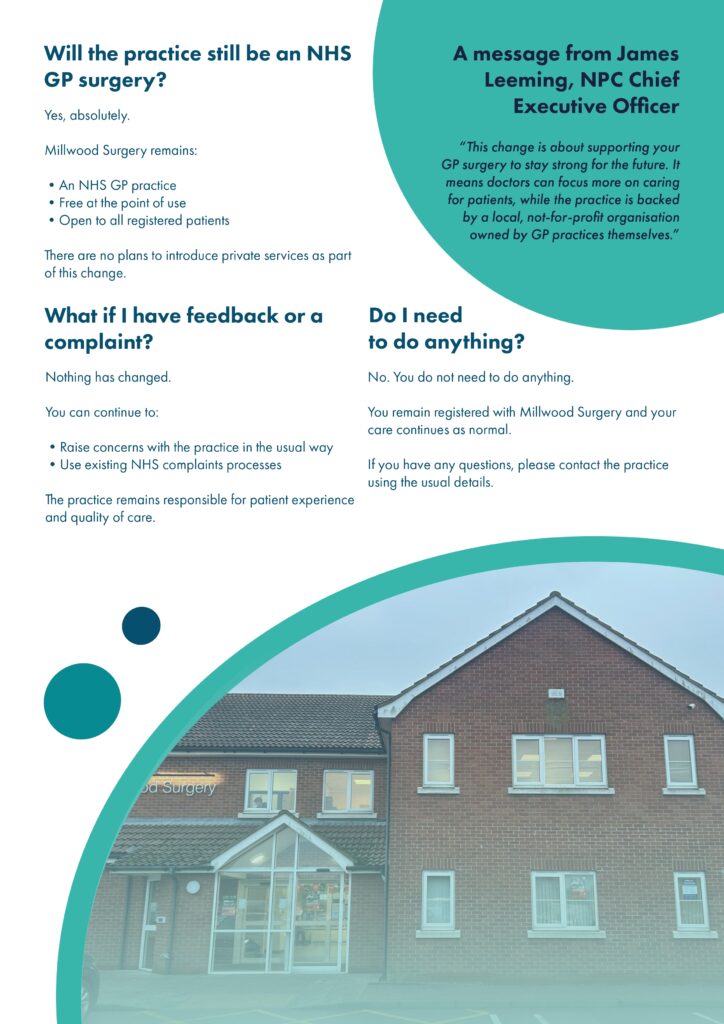 On 22 December 2025, the contract for Millwood Surgery transferred to an organisation called Norfolk Primary Care (NPC). Please read more below.